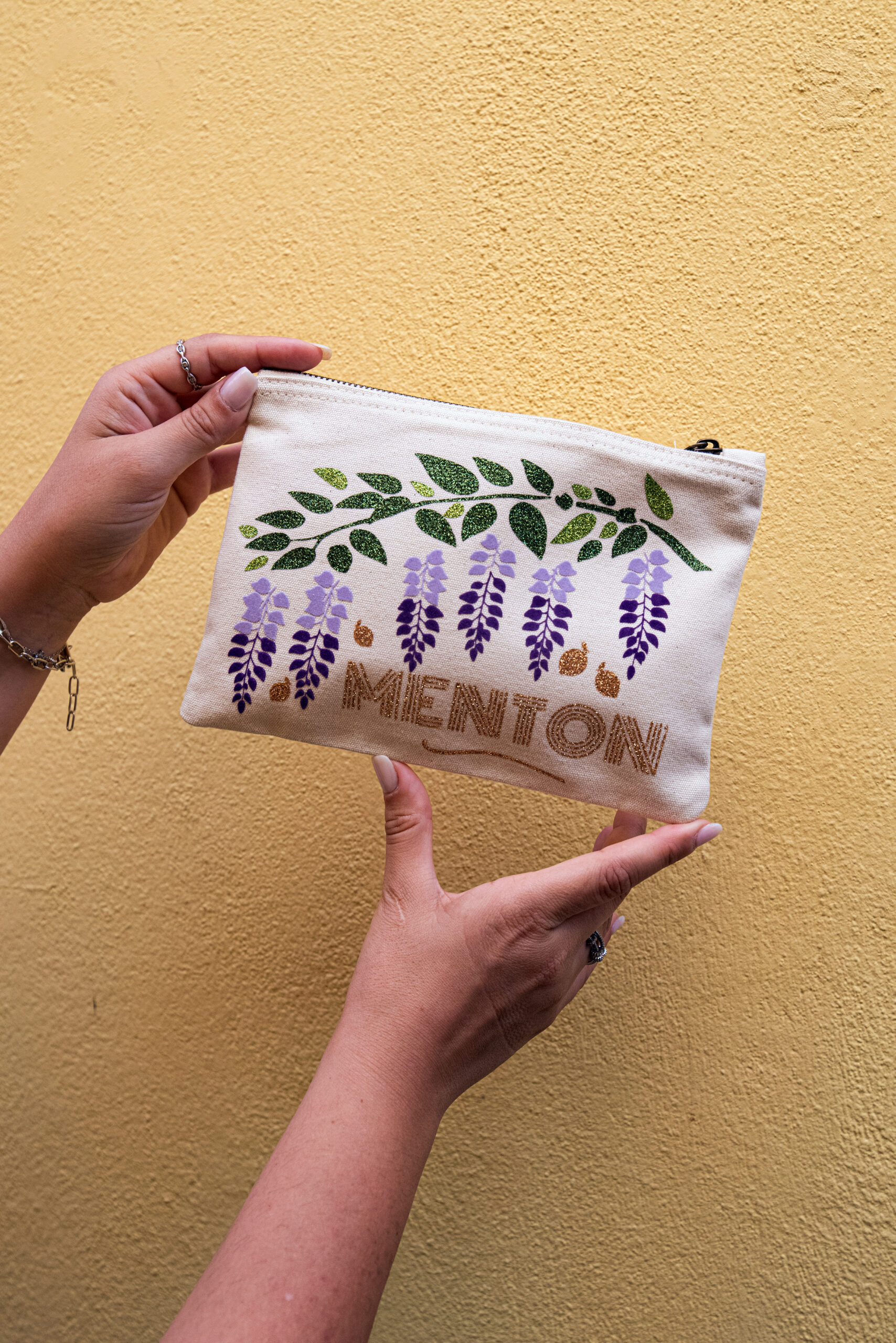 Cette trousse, on l’a dessinée avec de belles images plein soleil en tête: la glycine en velours mauve et violet, les citrons dorés pailleté.