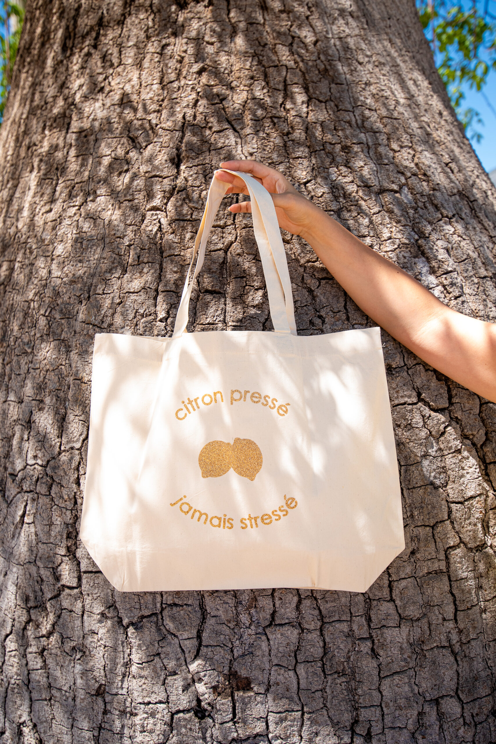 Sac citron pressé mais jamais stressé - écriture dorée pailleté -
